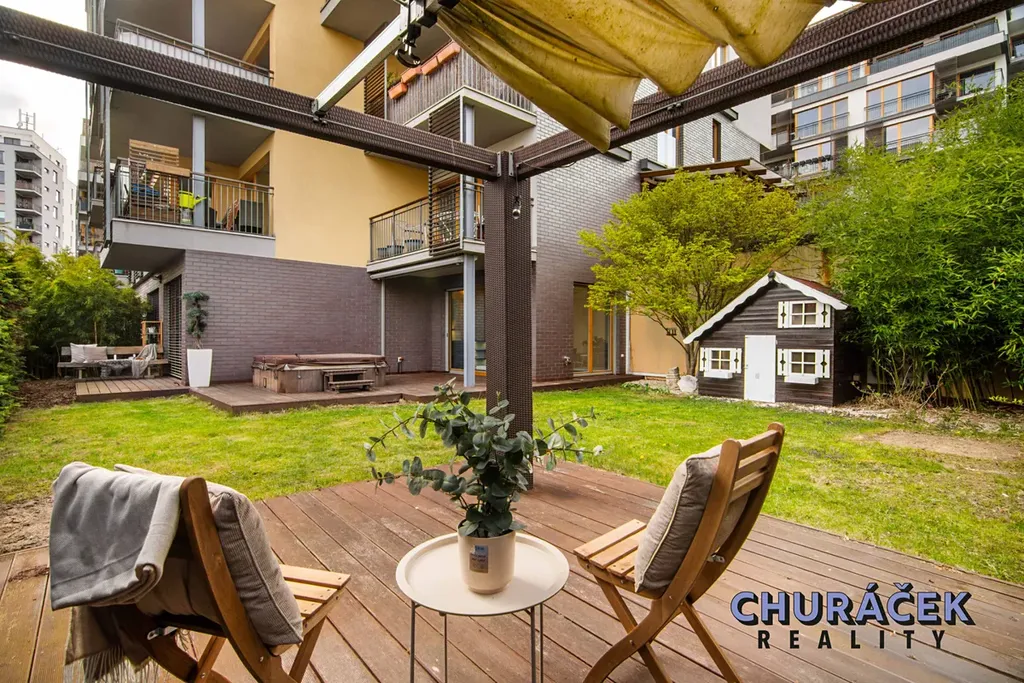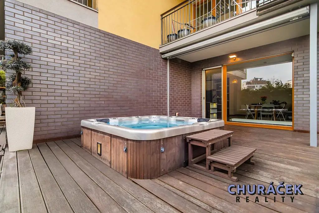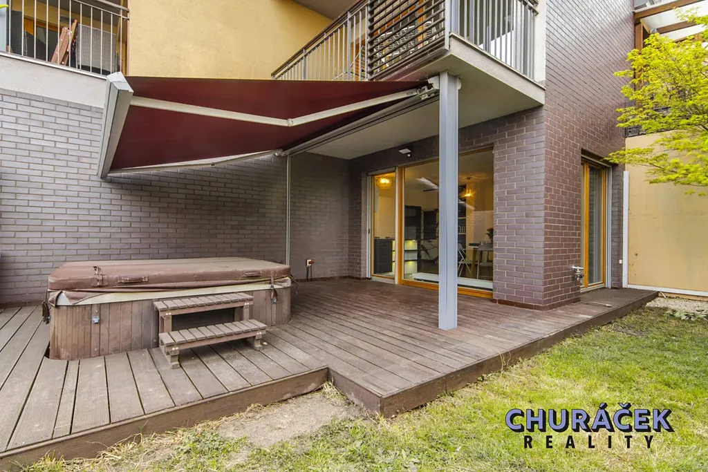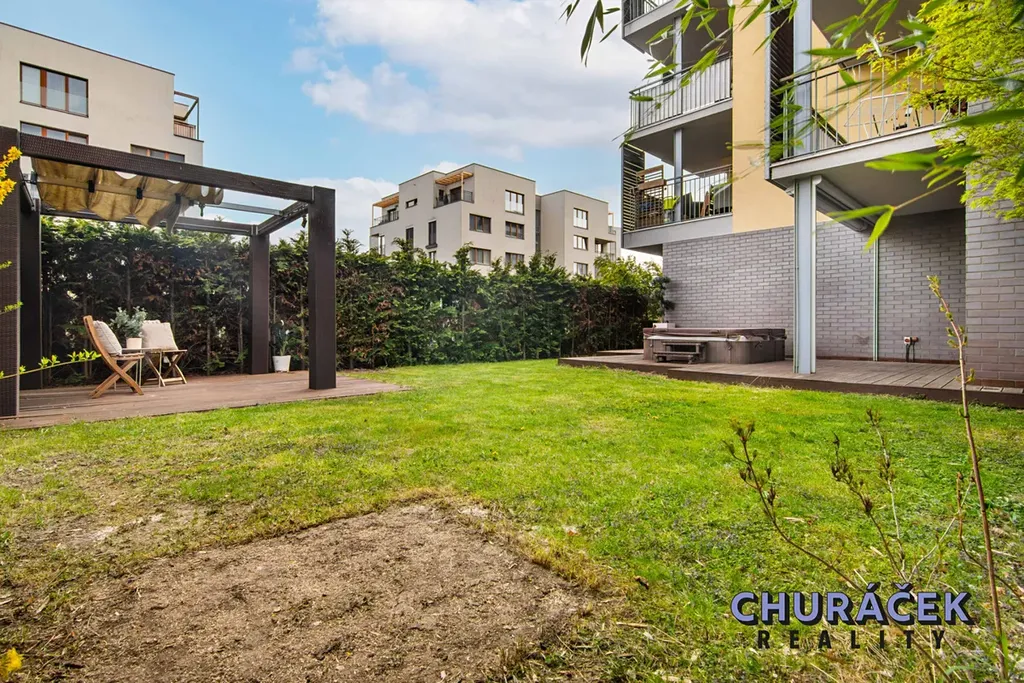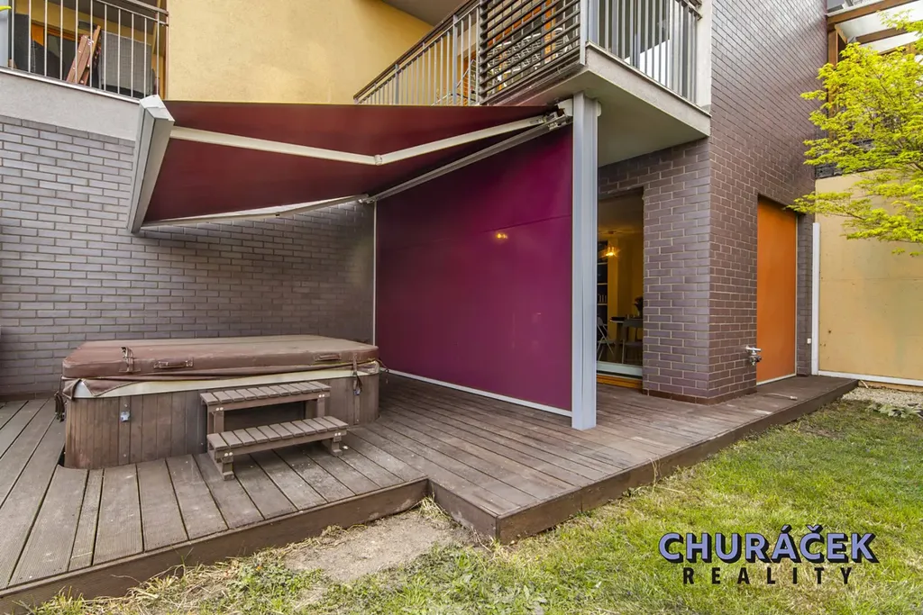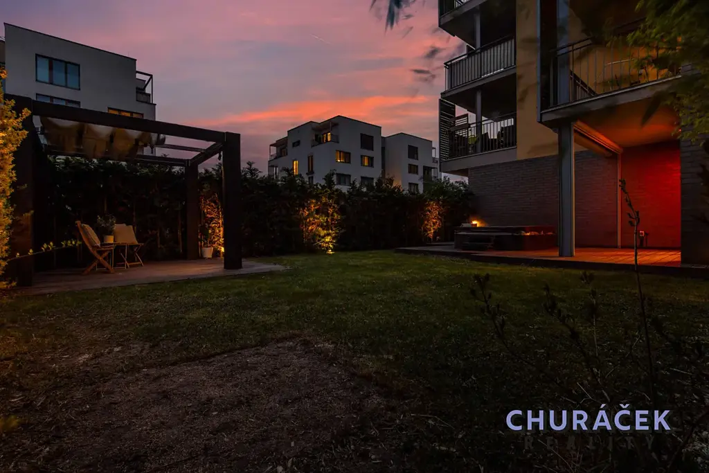 Byt má celkovou podlahovou plochu téměř 100 m² a je doplněn o soukromou předzahrádku o velikosti přibližně 200 m². Ta nabízí skutečný pocit soukromí, jelikož je situována ve vyvýšené části cca 4 metry nad okolním terénem. Zahrada je vybavena altánem, dětským domečkem, prostornou vířivkou a dále prvky zvyšujícími komfort užívání, jako je elektricky ovládaná pergola, venkovní osvětlení, stínění či sítě proti hmyzu.