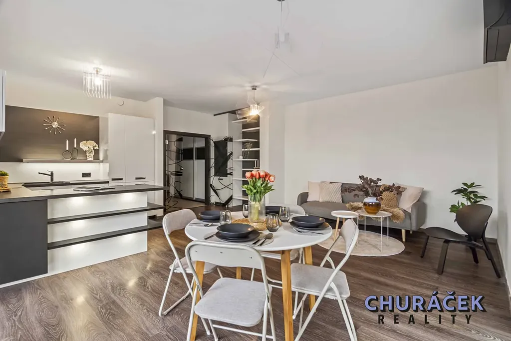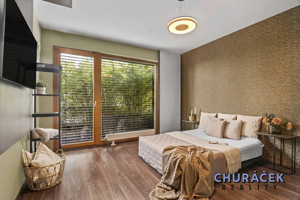 Dispozičně byt nabízí prostornou vstupní předsíň s dostatkem úložných prostor, světlý obývací pokoj s klimatizací a plně vybaveným kuchyňským koutem se vstupem na zahradu, dvě samostatné ložnice, velkorysou koupelnu, samostatné WC a praktickou úklidovou místnost, která může sloužit také jako šatna.