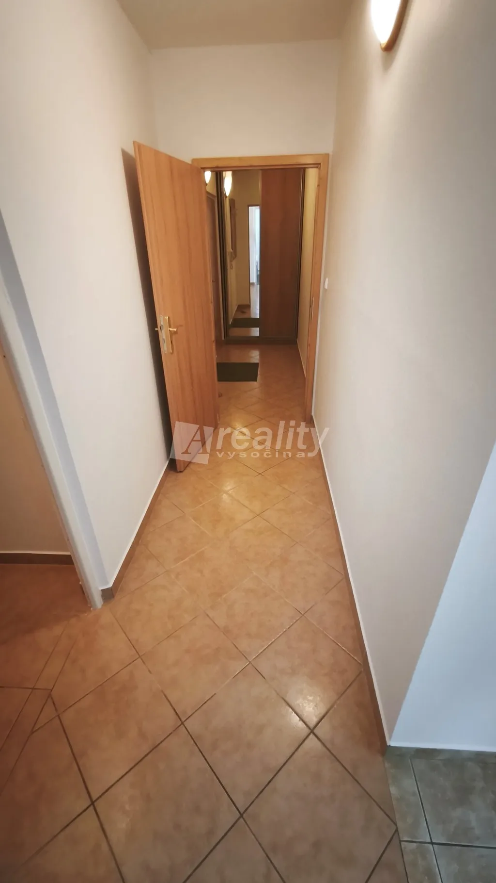 Dispozice bytu: z předsíně se chodbou dostaneme napravo do šatny s úložným prostorem, rovně do ložnice s manželskou postelí a nalevo je vstup do koupelny s umyvadlem, vanou, pračkou a WC, dále rovně do kuchyně s kuchyňskou linkou se spotřebiči (mikrovlnná trouba, myčka na nádobí, lednice s mrazákem, sklokeramická varná deska, elektrická trouba, digestoř) a jídelním stolem a přes kuchyň do obývacího pokoje, odkud je vstup na prostornou a slunnou lodžii.