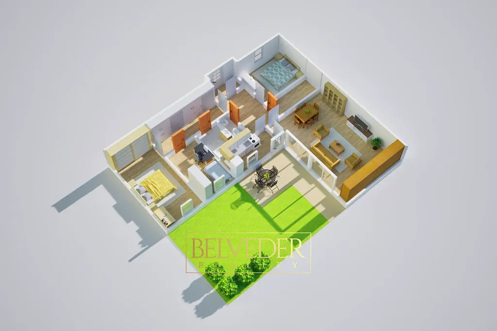 Exteriér: K domu náleží terasa ideální pro relaxaci a upravený pozemek o velikosti 232 m², který poskytuje dostatek soukromí, ale je nenáročný na údržbu.