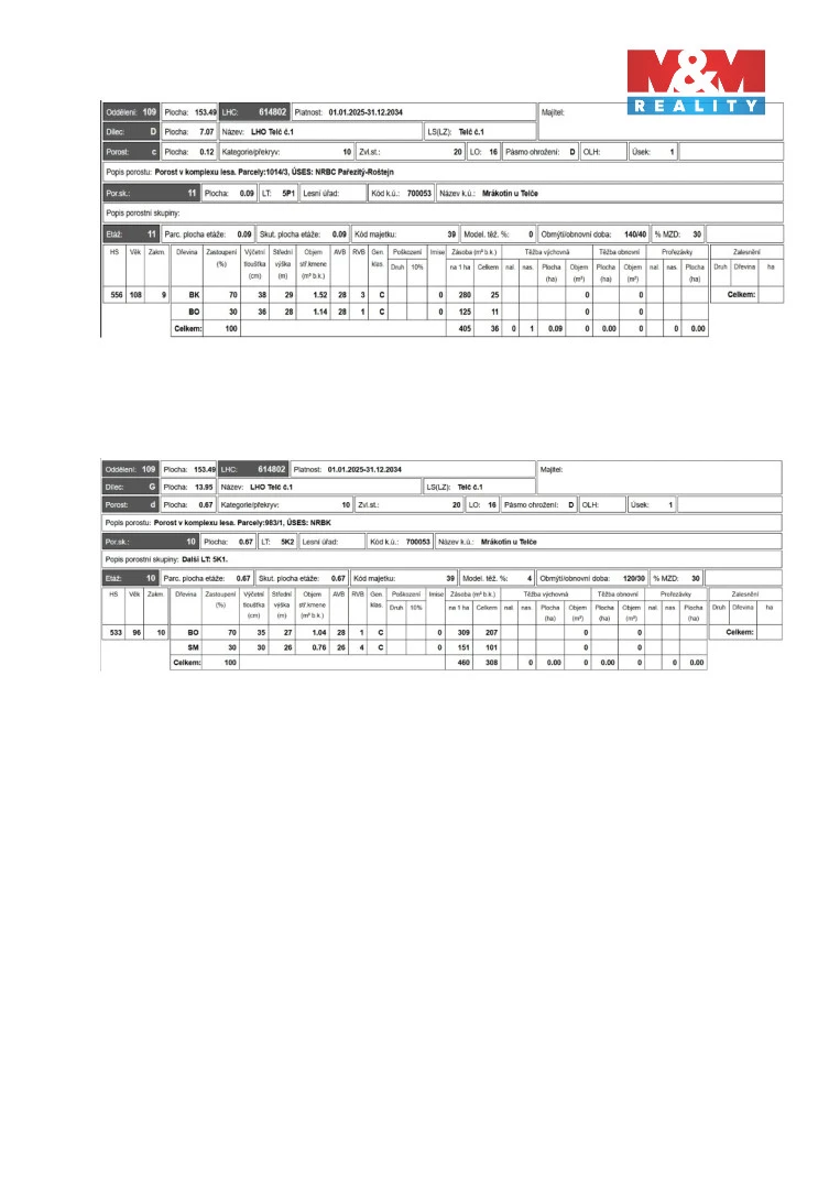 První z dvojice má výměru 6 600 m² a druhý o výměře 1 273 m², dokumenty od lesního hospodáře jsou k dispozici. Stav a zalesnění je dle přiložených fotografií.