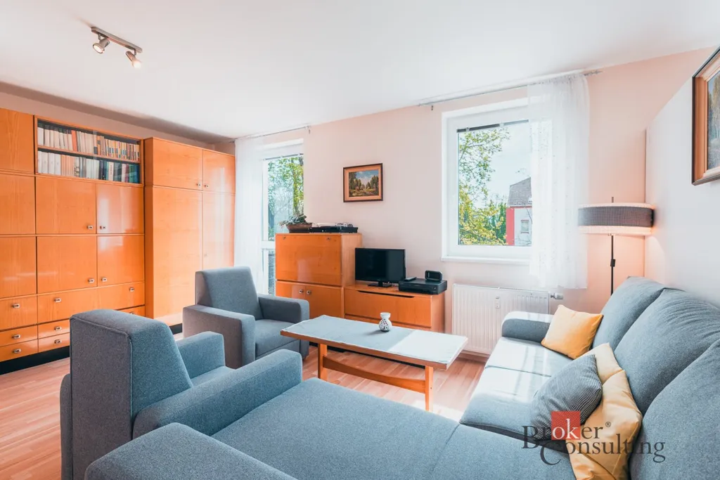 Na prodej světlý, prostorný byt s dispozicí 1+1 o celkové výměře 49 m2. Jednoduchou přestavbou lze dispozice změnit na 2+1. Nachází se ve 2. nadzemním podlaží bytového domu a je ve velmi dobrém stavu. K dispozici jsou 2 balkony o celkové ploše 4 m2. Široká okna směřující na jihovýchod zajišťují dostatek slunce po celý den. Byt se skládá se z prostorného obývacího pokoje, v současné chvíli přepaženého nábytkem, samostatné kuchyně, chodby s vestavěnými skříněmi a koupelny s WC. Ideální pro bydlení páru, či jednotlivce. Součástí bytu je i sklepní kóje umístěna v přízemí budovy a parkovací stání za závorou, na pozemku před domem. Dále je zde, živým plotem, ohraničený prostor s pergolou a místem pro děti.