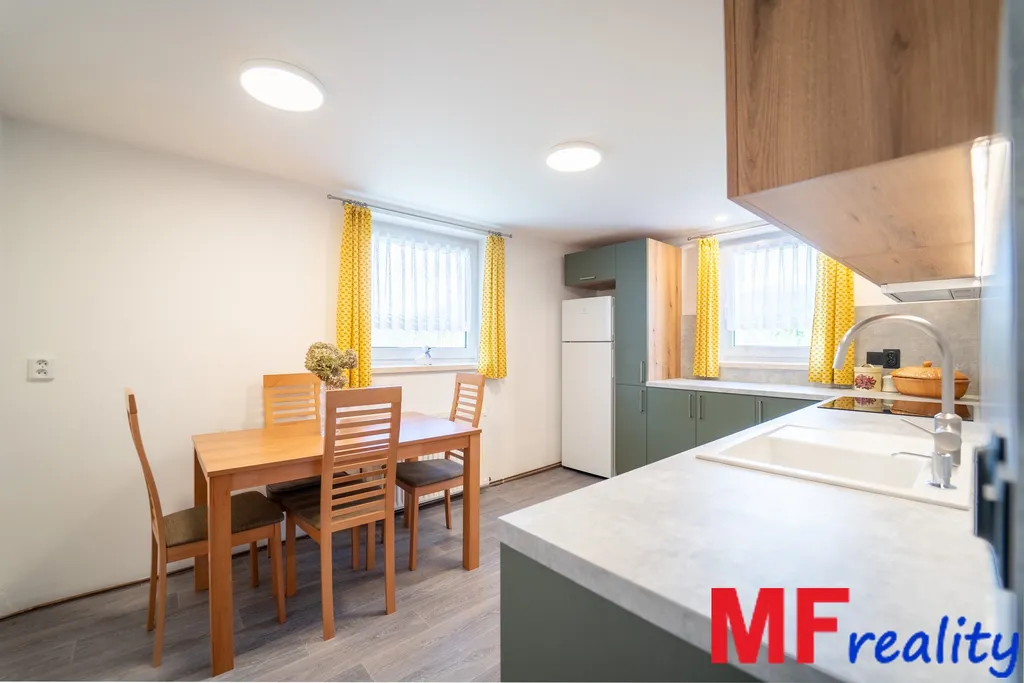 Dále následuje vstup do velice prostorné kuchyně s jídelním koutem s krásnou vestavěnou kuchyňskou linkou od společnosti Hanák se spotřebiči, lednicí s mrazícím boxem, myčkou, elektrickou indukční deskou s elektrickou troubou.