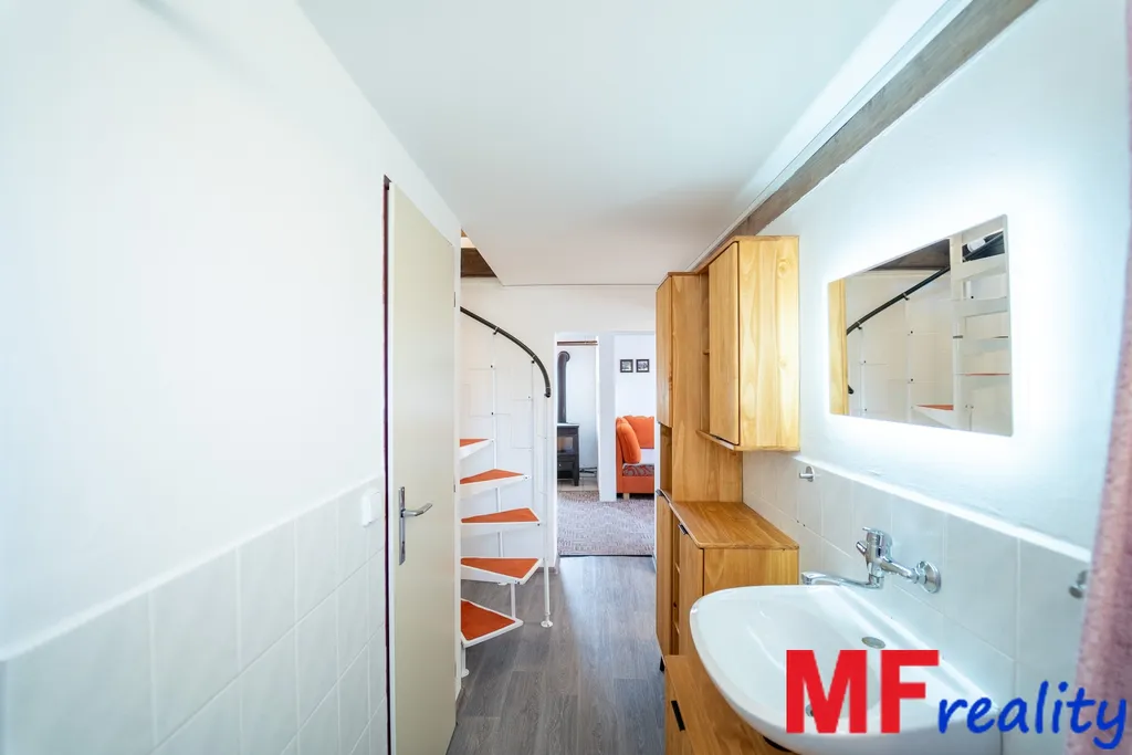 Koupelnu tvoří chodbička vybavena umyvadlem s toaletní skříňkou, bojler na ohřev vody, pračkou sprchovým koutem a samostatnou toaletou.