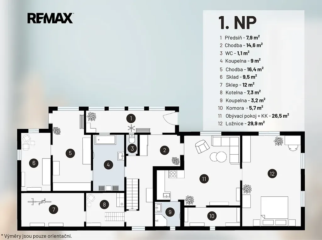 • Předsíň, chodba, WC, koupelna, chodba, kuchyň spojená s obývacím pokojem, ložnice, komora + skladovací a sklepní prostory.