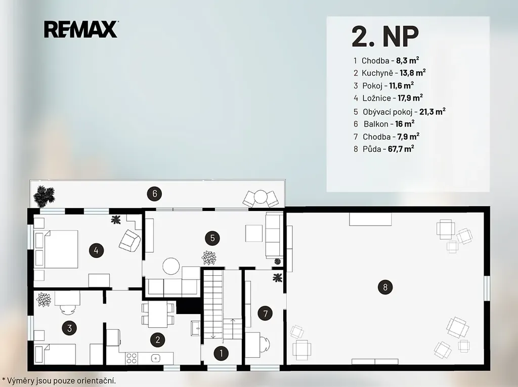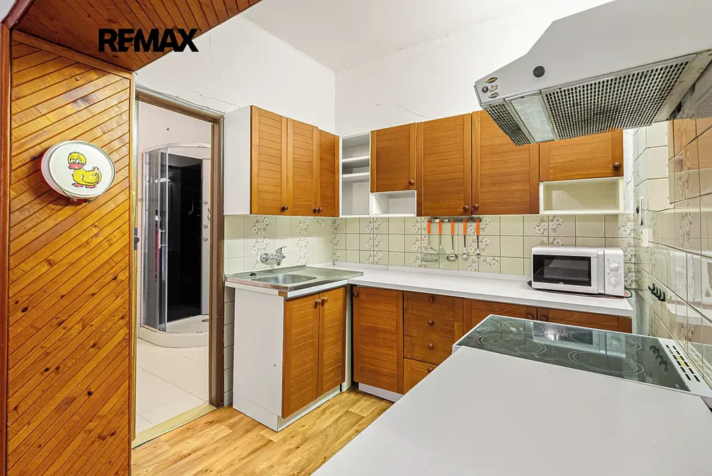 • Chodba, kuchyň, pokoj, ložnice, obývací pokoj, balkon, chodba, prostorná půda, která lze předělat na další obytnou část.