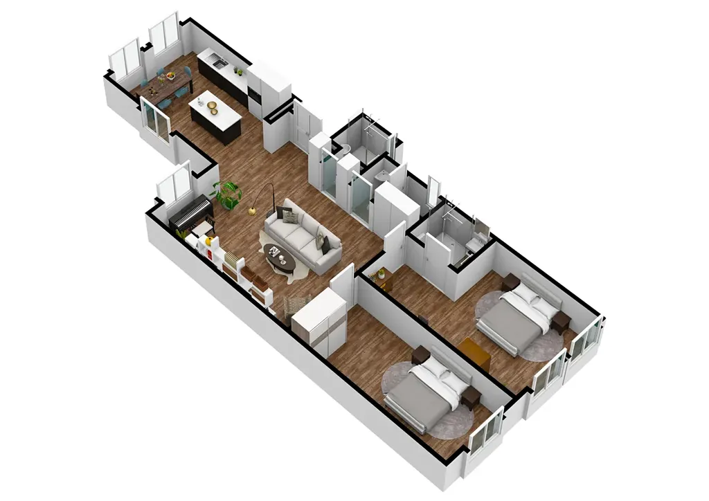 Byt o užitné ploše 108 m² disponuje prostorným obývacím prostorem propojeným s moderně řešenou kuchyní s jídelním stolem a dvěma samostatnými pokoji, které nabízejí dostatek soukromí i komfortu. Velkou výhodou jsou také dvě koupelny se sprchovými kouty a dvě samostatné toalety. Součástí bytu je i praktický sklep.