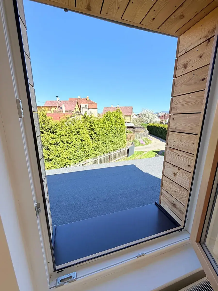 I exteriér domu dostal nový kabát. Zejména kompletní zateplení domu v kombinaci polystyrénu a vaty ve starší části domu a následné modřínové obložení, které dodává domu velmi moderní vzhled. Proti vlhkosti byla zhotovena drenáž kolem domu plus nopová fólie. Zahrada o celkové výměře 216 m2 dostala ze tří stran nový dřevěný plot. Dále zde najdeme nově vzniklou terasu s terasovými prkny, dřevník a kůlnu na uskladnění zahradního náčiní.