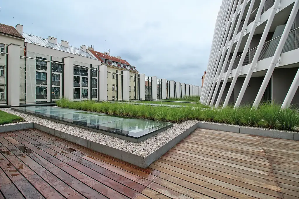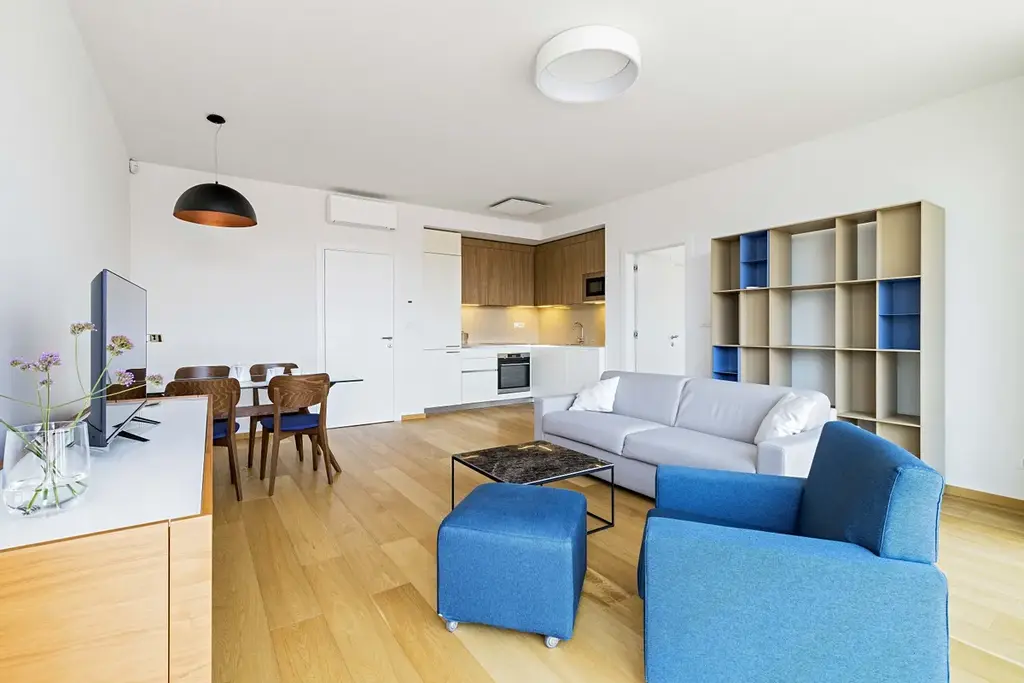Byt s terasou je elegantně navržený tak, aby uspokojil požadavky i náročného klienta. Na dokončení interiérů byly pečlivě vybírané ty nejkvalitnější materiály - dřevěné podlahy, francouzská okna, bezfalcové interiérové dveře, koupelny od oblíbeného a světově známého výrobce Villeroy & Boch, celoplošné podlahové vytápění, klimatizace. Prostorná vstupní hala a vestavěné skříně nabízí dostatek úložného prostoru. Uzavřený areál s 24 hodinovou recepcí s ostrahou Vám zajišťuje maximální soukromí, klid a bezpečí ve Vašem novém domově. Byt je plně vybaven a v zařízených apartmánech je součástí nájmu úklid 2x měsíčně, včetně výměny ložního prádla a ručníků, dále pak údržba předzahrádky.