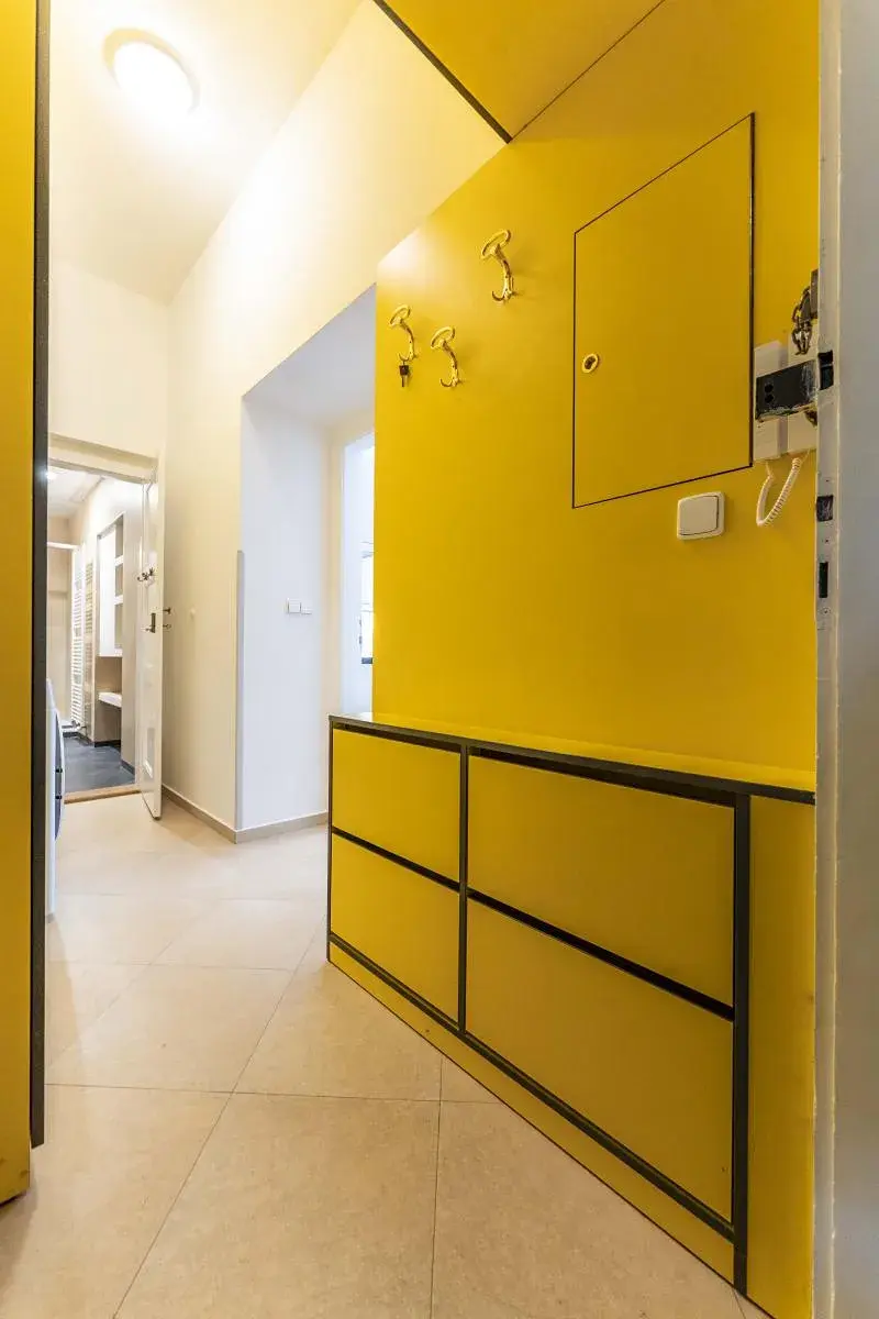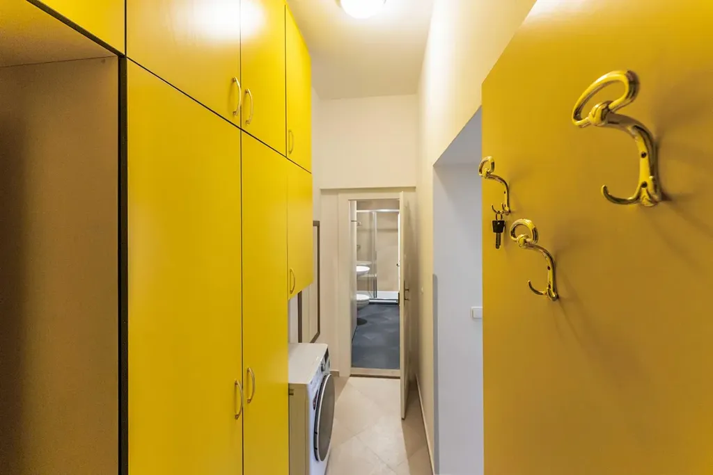 Byt má velmi dobře vyřešené úložné prostory, s množstvím vestavných skříní především ve vstupní chodbě bytu, kde se nalézá rovněž pračka se sušičkou, kvůli úspoře místa.