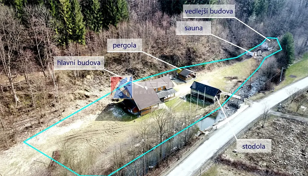 Součástí prodeje je také prostorná pergola se zázemím, stodola, samostatná sauna a druhá nemovitost určená k celkové rekonstrukci na pozemku p.č. st. 408.
