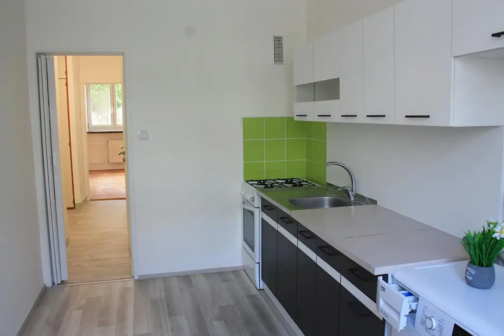 Kuchyně i s místem na jídelní stůl, kuchyňskou linkou, plynovým sporákem a elektrickou troubou. Pračkou a skříňí na potraviny.