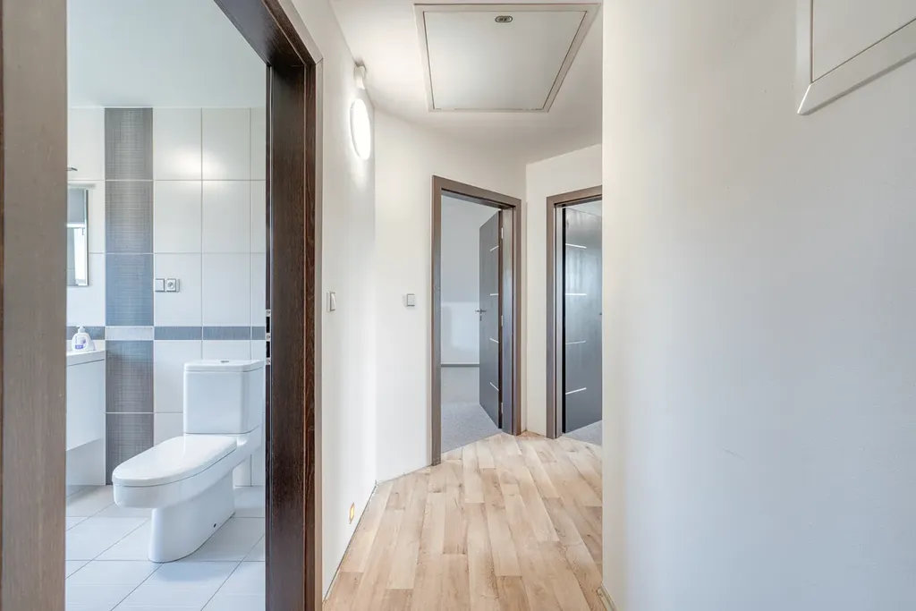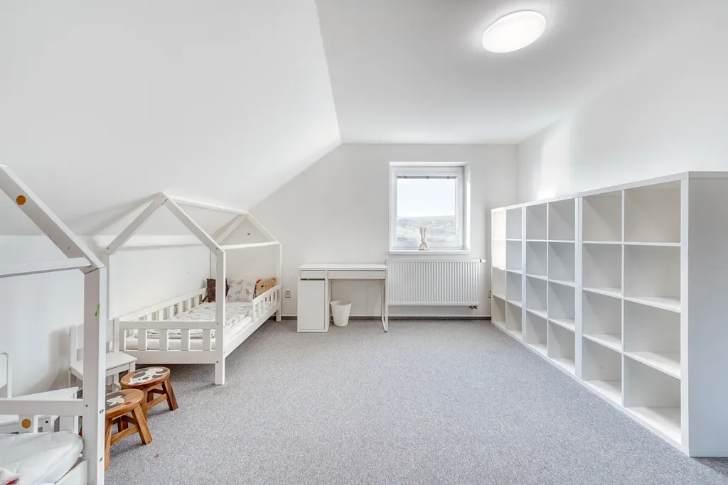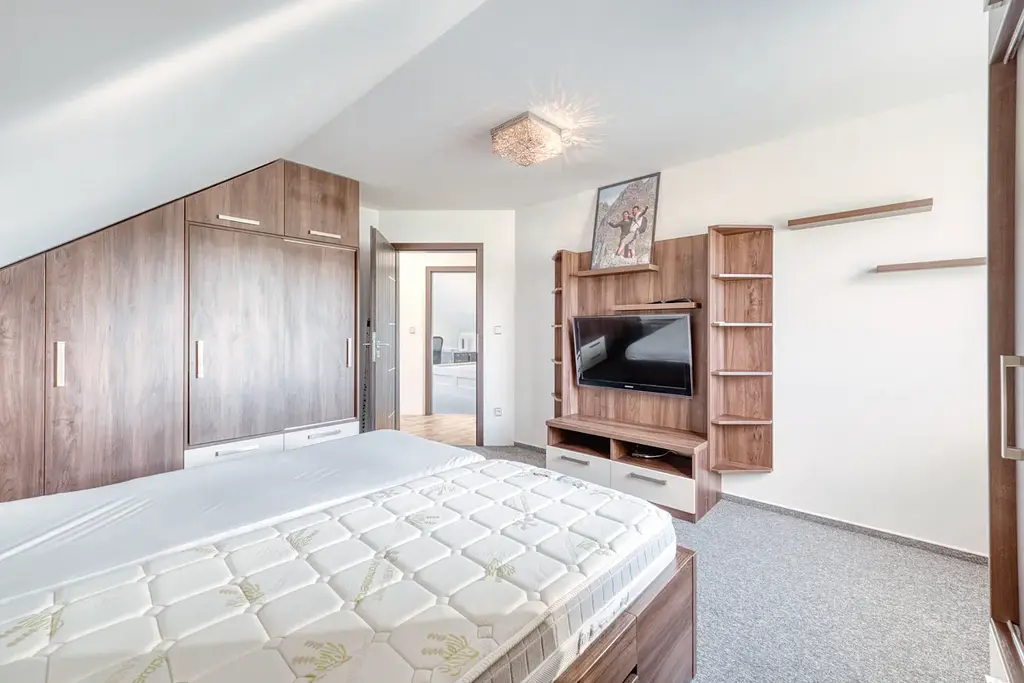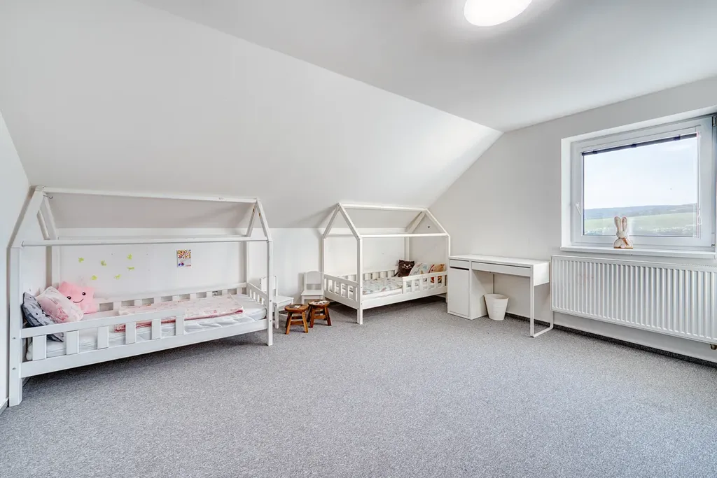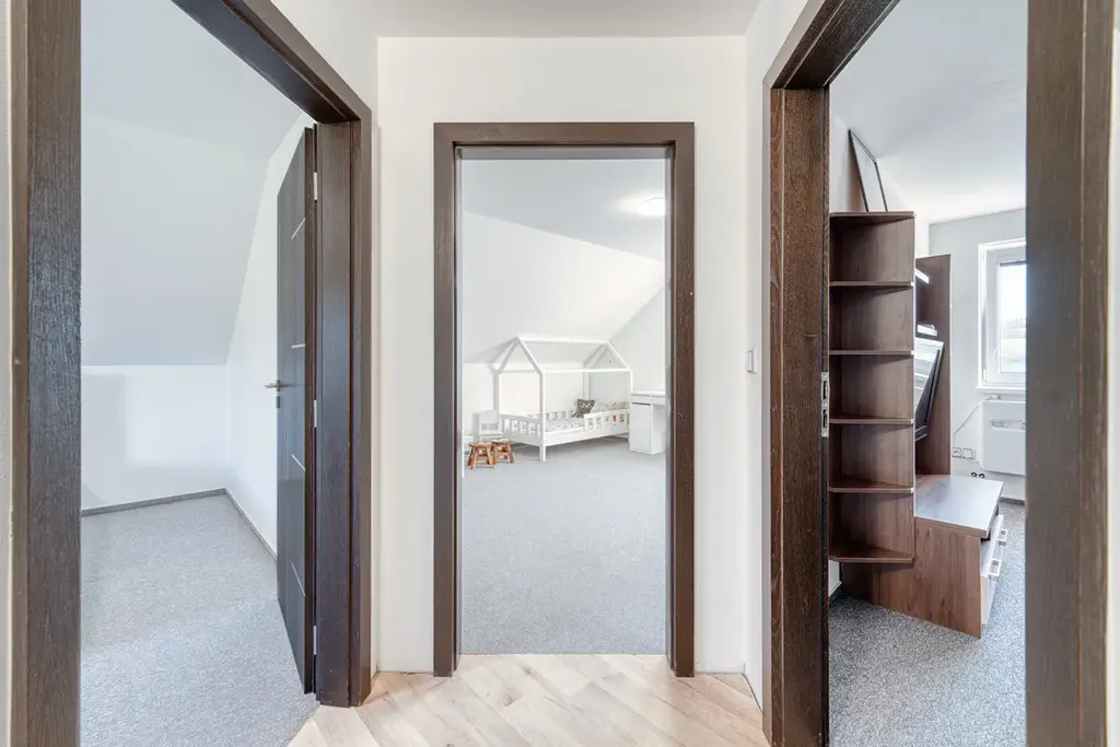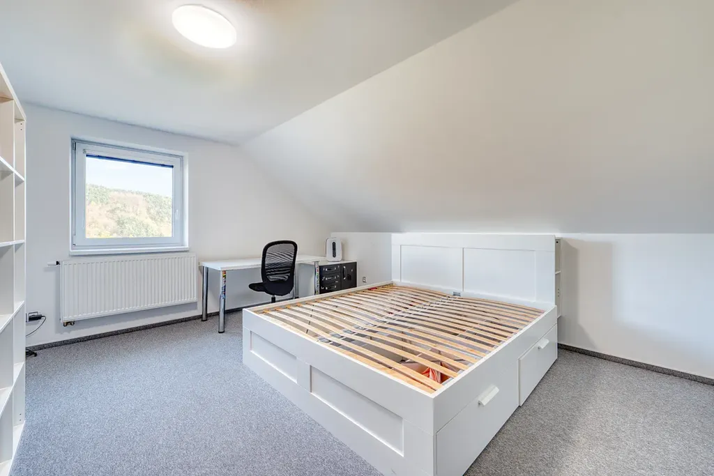 Dům je tvořen bytovou jednotkou o dispozici 5+KK, tvořenou v přízemí kuchyní s jídelnou o ploše 18,7m2, se vstupem do zimní zahrady s nádherným výhledem do krajiny, dále obývacím pokojem o ploše 19,1 m2, vstupní chodbou s vestavěnými skříněmi a se schodištěm do II. NP o celkové ploše 14,6m2, koupelnou s vanou a toaletou o ploše 9,2 m2, chodbou se schodištěm do sklepa a garáží o ploše 26,8m2. V podkroví jsou situovány tři obytné pokoje, každý o ploše 16,7 m2, dále koupelna se sprchovým koutem a toaletou o ploše 9 m2. Nad garáží je dále velká půda se vstupem ze štítové zdi.