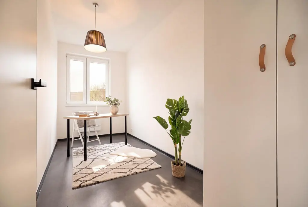 Interiér bytu byl realizován před 4 lety s důrazem na detail, funkčnost a estetiku. Dominantou je velkorysý obývací prostor s kuchyňským koutem, který je přirozeně oddělen designovým ostrůvkem ideální místo pro setkávání rodiny i přátel. Kuchyňská linka je vyrobena na míru a doplněna vestavěnými skříněmi, které zajišťují dostatek úložného prostoru.