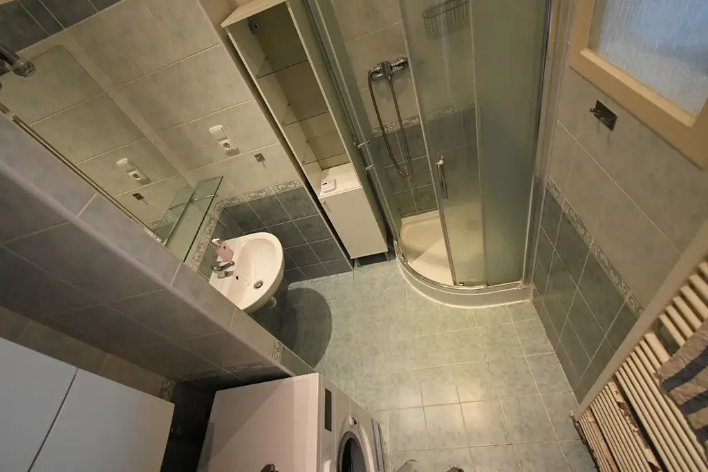 Koupelna se sprchovým koutem, zánovní automatická pračka, samostatné WC, klidná ložnice.