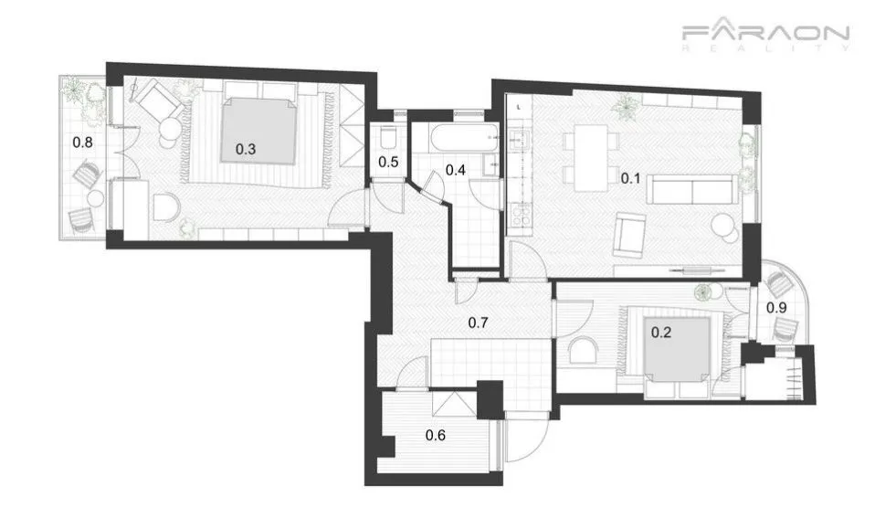 Dispozice bytu tvoří prostorný obývací pokoj s novou plně vybavenou kuchyní, dvě samostatné ložnice (každá má balkón), velká vstupní hala, komora, šatna, koupelna s vanou, samostatná toaleta. Jedna ložnice je orientována do klidného vnitrobloku, druhá do ulice Sokolovská. Kuchyň je vybavena elektrickým sporákem s troubou, lednicí s mrazákem, myčkou na nádobí, mikrovlnnou troubou a pračkou. V bytě je vlastní plynový kotel, nová okna.