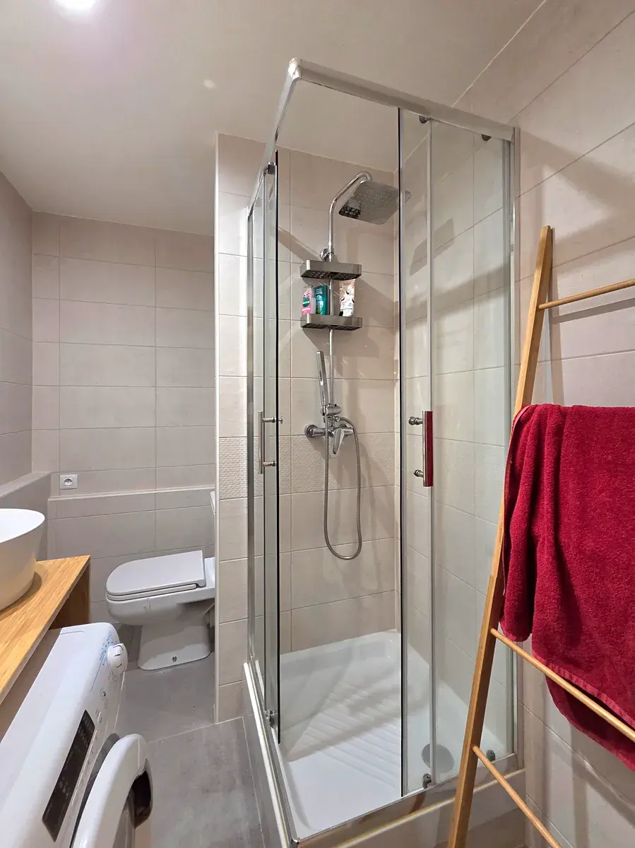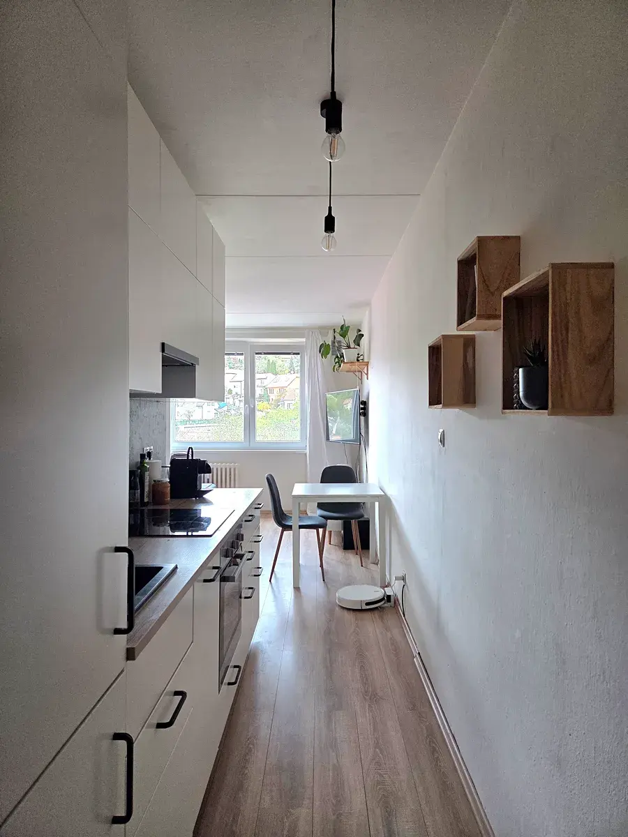 Z chodby se můžeme vydat dvěma cestami - první vede do kompletně zrekonstruované koupelny (r. 2022) se zděným jádrem, sprchovým koutem, toaletou a místem na pračku. Druhá cesta vede kuchyní, která byla součástí téže rekonstrukce a pokračuje do obytného prostoru, který má příčkou lehce vymezen prostor na postel a otevírá se do obývacího pokoje.