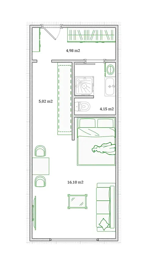 Byt má výměru 31 m2, je umístěn v 5. NP a má velmi zajímavě řešenou dispozici, která odděluje jednotlivé části (viz. půdorys).