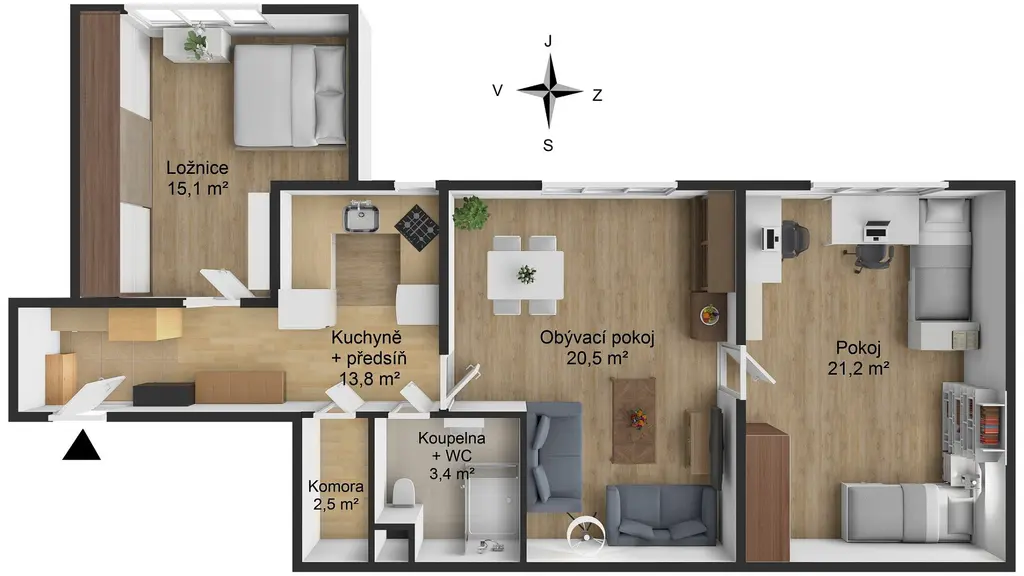 Dispozice je řešená prakticky – vstupní předsíň, ze které se vstupuje do ložnice a také do samostatné spíže, dále navazuje kuchyně v otevřeném prostoru, koupelna a komora. Z této části se pak vstupuje do obývacího pokoje a dalšího samostatného pokoje.