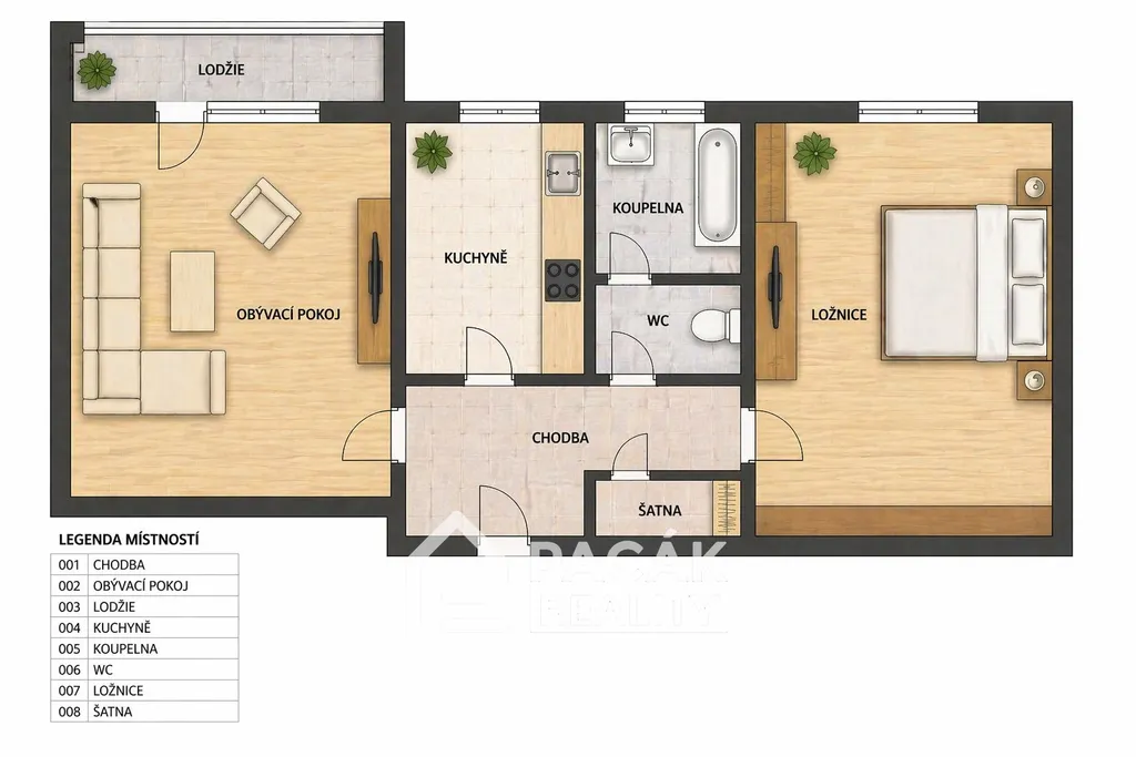 Dispozice bytu nabízí dva samostatné neprůchozí pokoje, jeden se vstupem na lodžii, kuchyni. Z předsíně je vstup do zděné šatny, která poskytuje praktický úložný prostor. Koupelna je společná s WC. Jednotlivé místnosti jsou přístupné z chodby, což zajišťuje komfortní a funkční uspořádání.