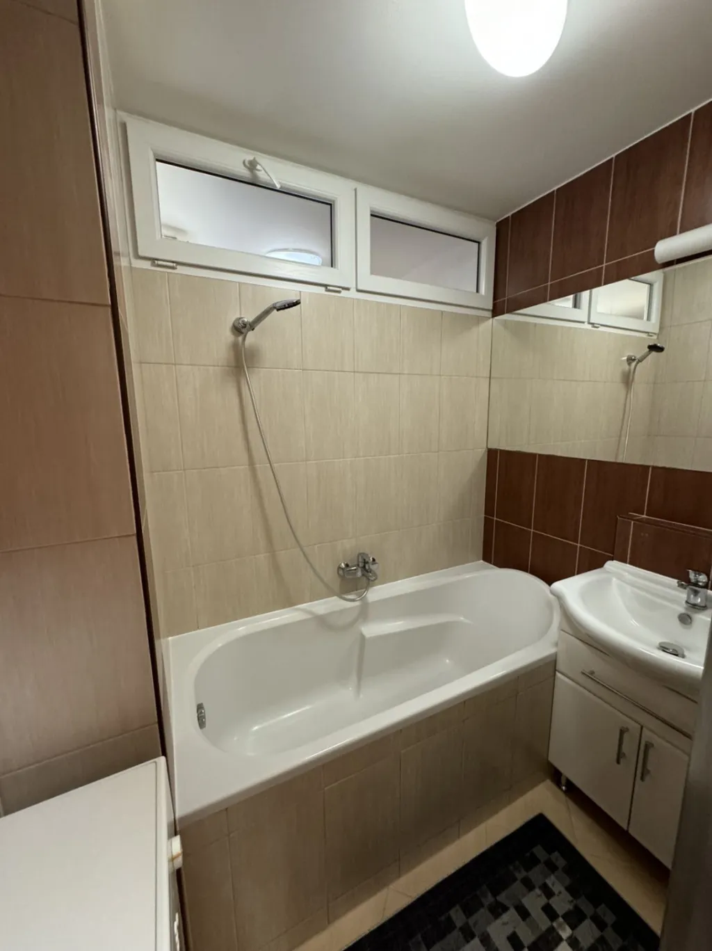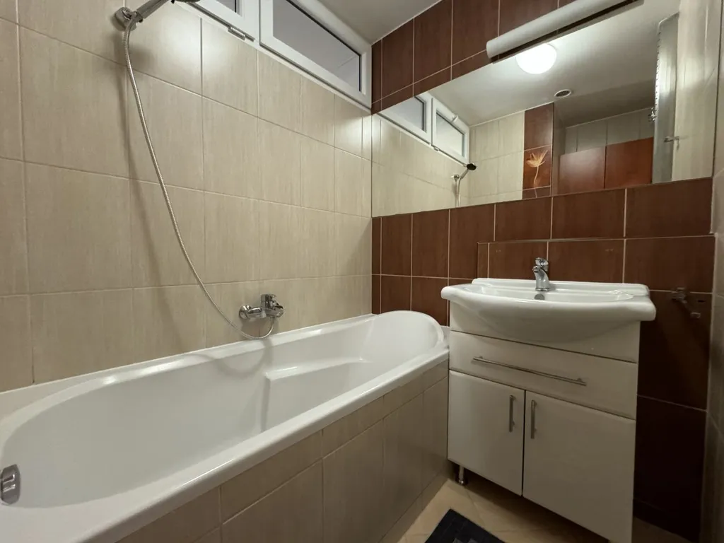 Koupelna disponuje vanou, umyvadlem s vestavěnou skříňkou a osvětlením. Pračka je součástí koupelny. Nad pračkou je také úložný prostor. Toaleta je odděleně.