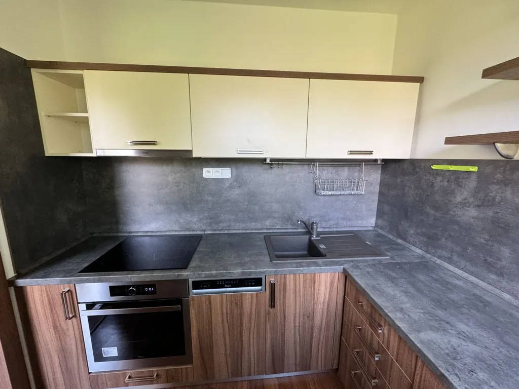Kuchyňská linka je opatřena vestavěnými spotřebiči (sklo keramická deska, elektrická trouba, digestoř, myčka, lednice, pračka).