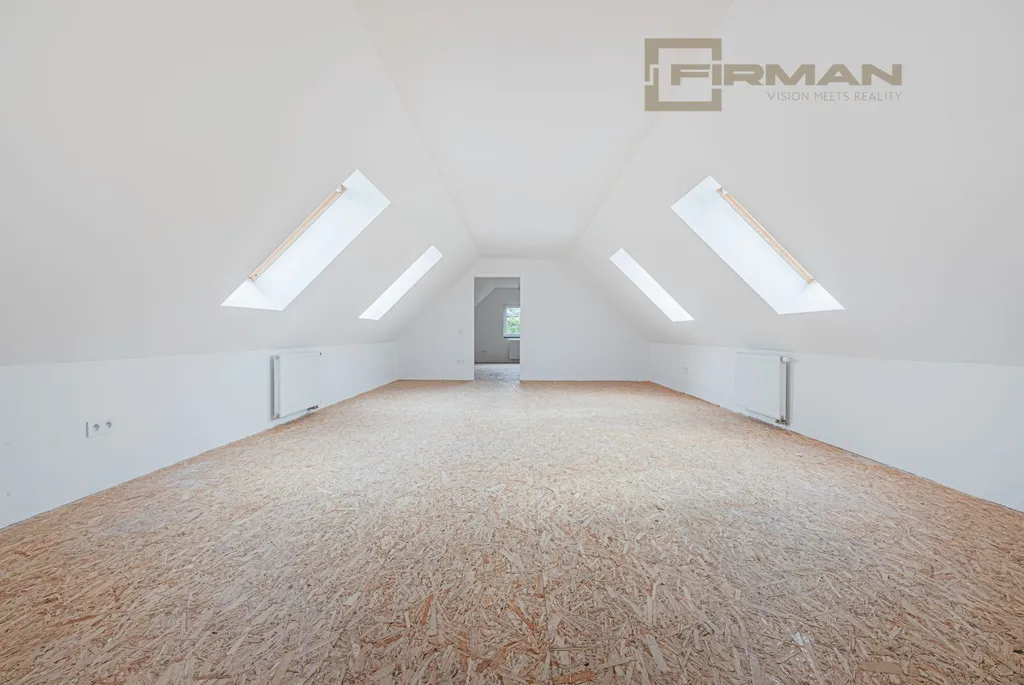 V patře pak dominuje velkorysý obytný prostor, ideální jako herna nebo společenská zóna pro děti. Nechybí ani samostatné WC, koupelna a další pokoj, který se skvěle hodí jako dětský pokoj či klidné zázemí pro práci.