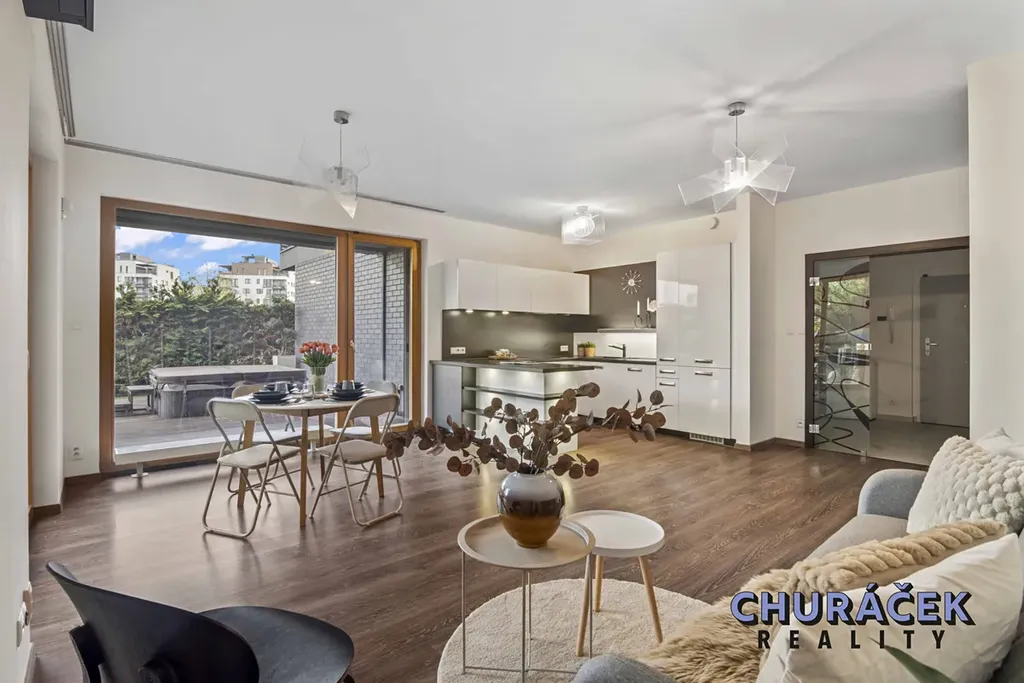 Byt má celkovou podlahovou plochu téměř 100 m² a je doplněn o soukromou předzahrádku o velikosti přibližně 200 m². Ta nabízí skutečný pocit soukromí, jelikož je situována ve vyvýšené části cca 4 metry nad okolním terénem. Zahrada je vybavena altánem, dětským domečkem, prostornou vířivkou a dále prvky zvyšujícími komfort užívání, jako je elektricky ovládaná pergola, venkovní osvětlení, stínění či sítě proti hmyzu.