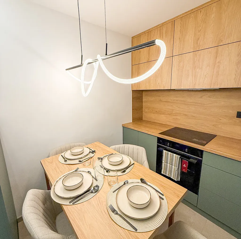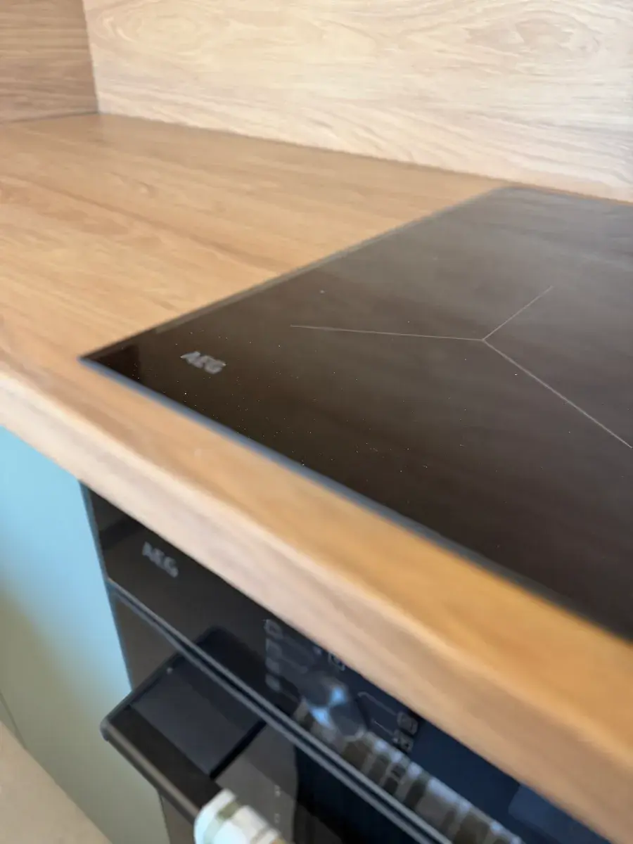 Veškerý nábytek byl vyroben na míru truhlářem, interiérové dveře jsou rovněž zakázkové. Celek působí čistě, jednotně a nadčasově – bez improvizací a levných řešení.