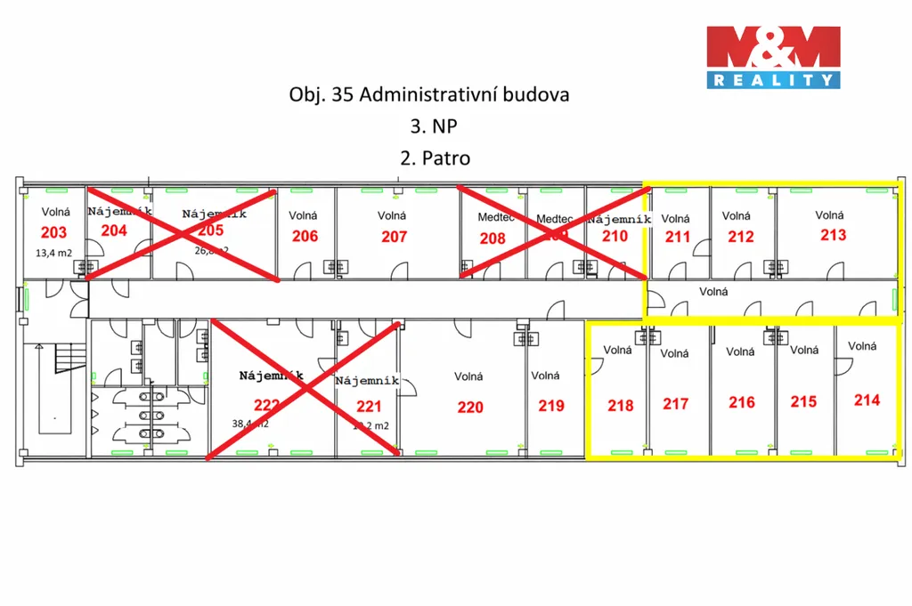 Nabízíme pronájem volných kanceláří v administrativní budově na ul. Brněnská v Hradci Králové. Kancelář na plánku označená jako č. 217 a 218 se nachází ve 3. nadzemním podlaží. V místnosti je umyvadlo. Toalety a kuchyňka jsou společné. Součástí nájmu je i jedno parkovací místo v areálu u budovy. Volné kanceláře jsou jak ve 3. tak i ve 4. nadzemním podlaží. Nájemné činí 2500 Kč/m²/rok + poplatky 1000 Kč/m²/rok. Více informací u makléře.