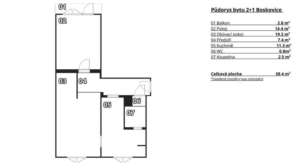 Byt se nachází ve 2. nadzemním podlaží panelového domu po částečné revitalizaci. Celková užitná plocha bytu činí 58 m² s dostatkem vestavěného úložného prostoru. Byt procházel postupně modernizací, před dvěma lety bylo vybudováno nové zděné koupelnové jádro se sprchovým koutem vč. elektroinstalace, vodoinstalace.