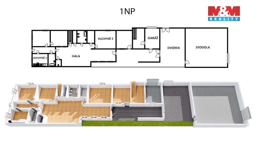 Užitná plocha je zatím 253 m², dispozičně řešeno jako dvougenerační 2+1 a 3+1 s vejminkem.