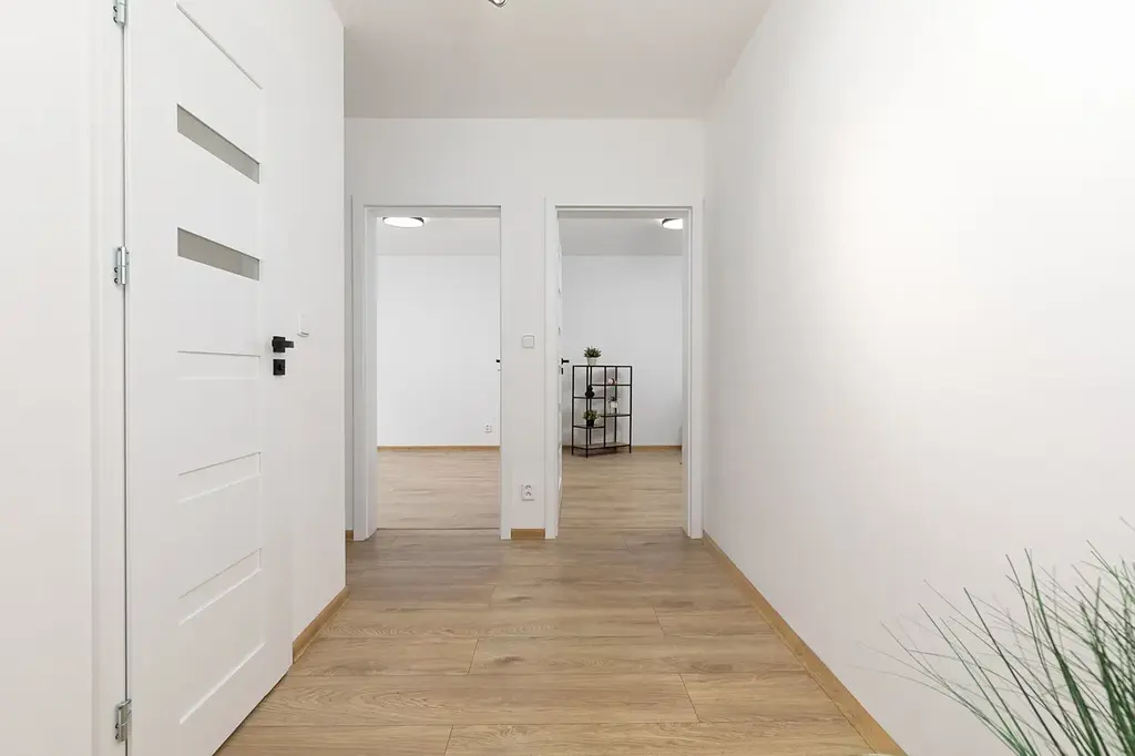 Byla udělána nová elektroinstalace v mědi, omítky, v celém bytě jsou laminátové voděvzdorné plovoucí podlahy, nové interiérové dveře s obložením, nové vstupní bezpečností a protipožární dveře společnosti HT dveře.