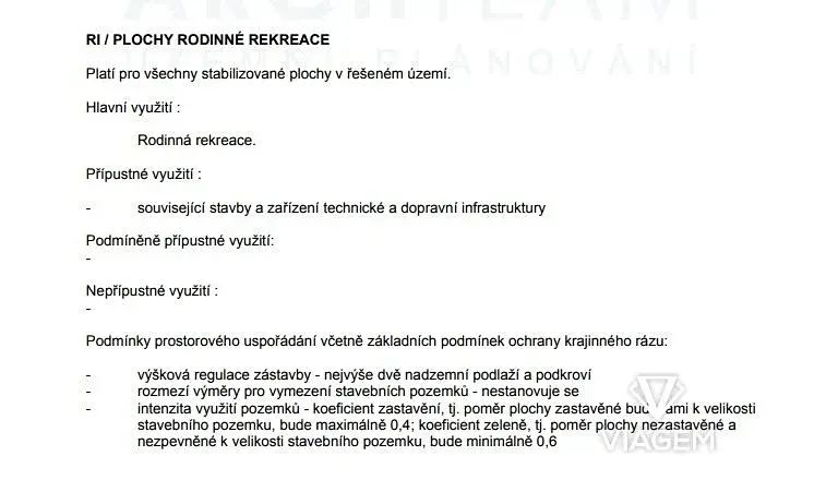 Pozemek je ideální pro výstavbu rekreační chaty – dle regulativů je možné postavit objekt s maximálně dvěma nadzemními podlažími.