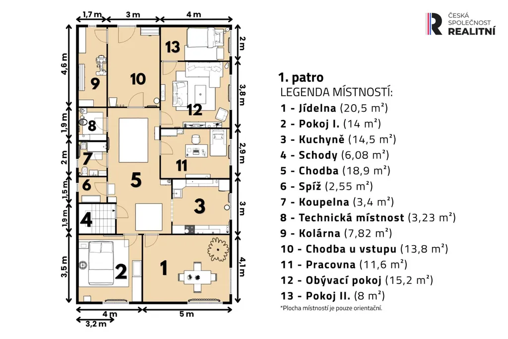 1. patro (cca 130 m²) s dispozicí 5+1 se 3 komorami je ideální na bydlení pro rodinu s dětmi