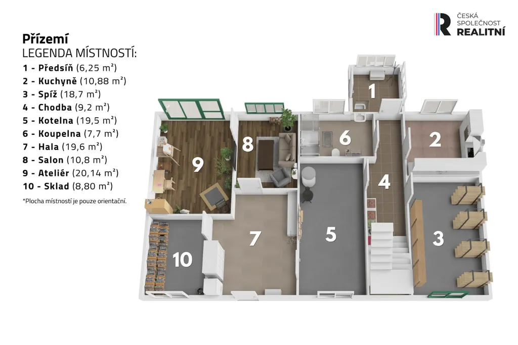 Přízemí (cca 130 m²) tvoří technické zázemí (sklep, kotelna, prádelna, sklady) a možnost vybudování samostatné bytové jednotky nebo atelieru či kanceláře