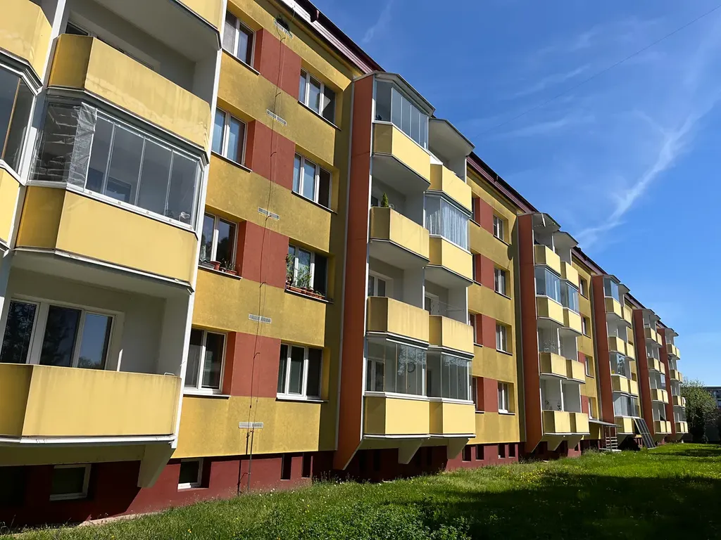 U bytového domu leží na jižní slunečné straně uzavřený travnatý dvůr.