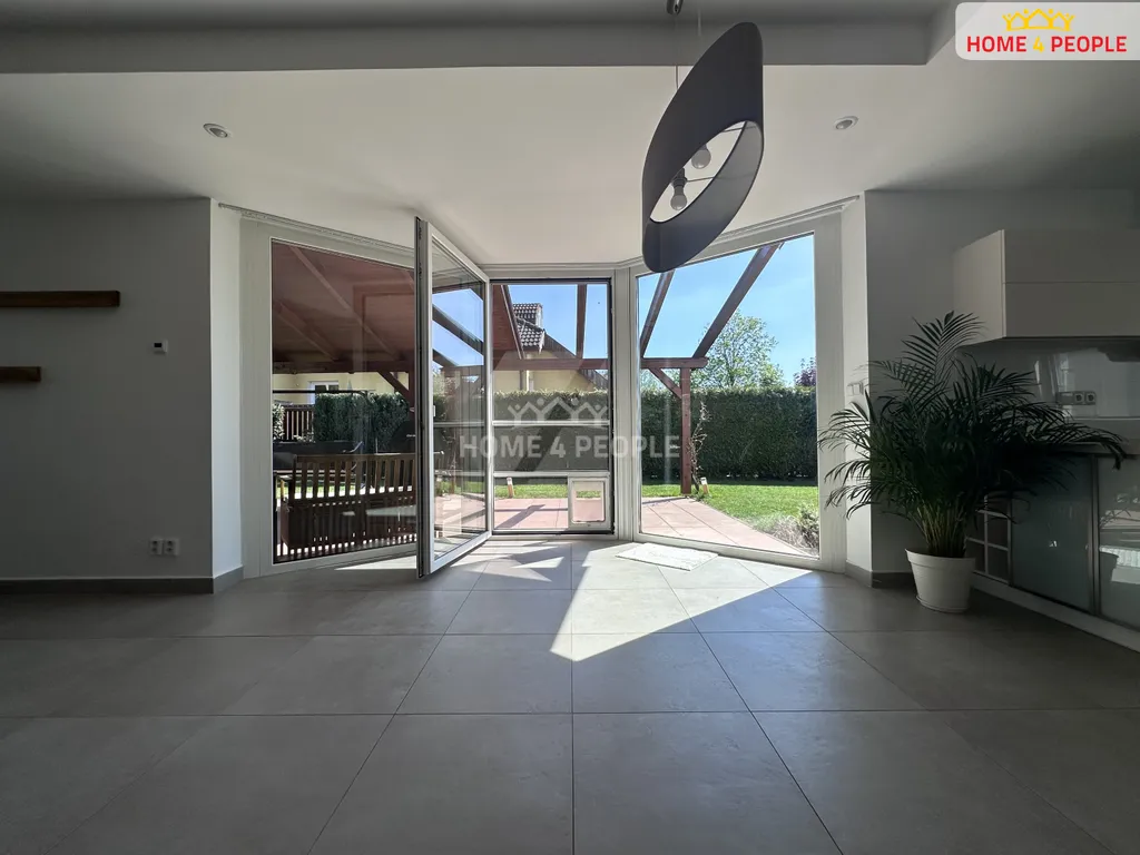 velkorysý obývací prostor s přímým vstupem na terasu a plně vybavená kuchyně