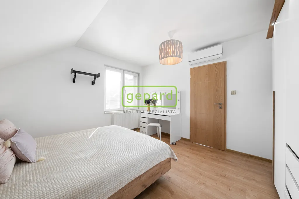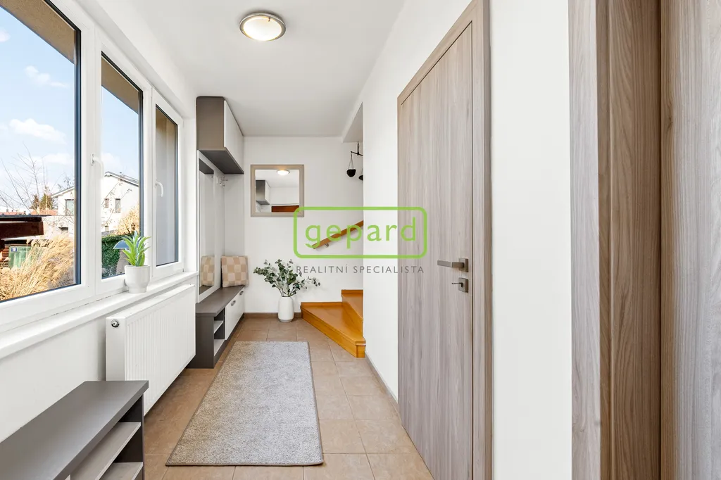 Už při vstupu vás překvapí příjemná vzdušnost a množství světla. Hlavní obytné podlaží působí otevřeně a přirozeně propojuje obývací prostor s kuchyní, odkud se vychází na balkon. Je to místo pro každodenní život a setkávání. Nechybí ložnice s vestavěnou skříní a koupelna s vanou. Horní patro nabízí další úroveň soukromí – samostatné pokoje, pracovnu i oddělenou koupelnu a toaletu. Velkým benefitem je terasa s otevřeným výhledem do okolní krajiny, která má své kouzlo v každém ročním období. Jeden z pokojů je navíc rozšířen o praktické spací patro, které přidává další využitelné metry – ať už pro spaní, relax nebo kreativní prostor.