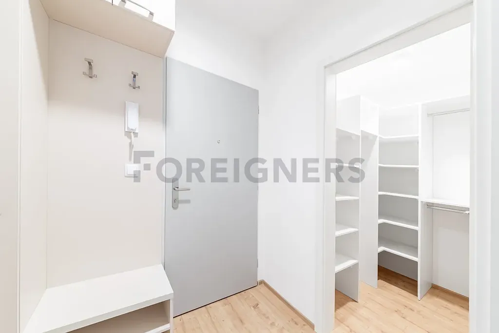 Prostorná chodba s nábytkem na míru, včetně praktické a dobře promyšlené šatny, která nabízí maximální úložný prostor.