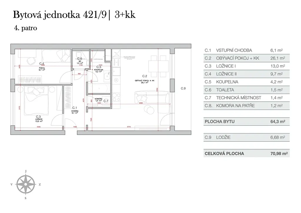 Byt je dispozičně velmi dobře řešený s prostornou kuchyní a obývacím pokojem a se dvěma neprůchozími prostornými ložnicemi, nádhernou koupelnou, samostatnou toaletou a technickou místností. V bytě je dostatek místa na úložné prostory a skříně. Byt má zrevitalizovanou lodžii a komoru na patře. Byt je celkově velmi tichý s výhledem do přírody. Parkování je bezproblémové kolem domu.