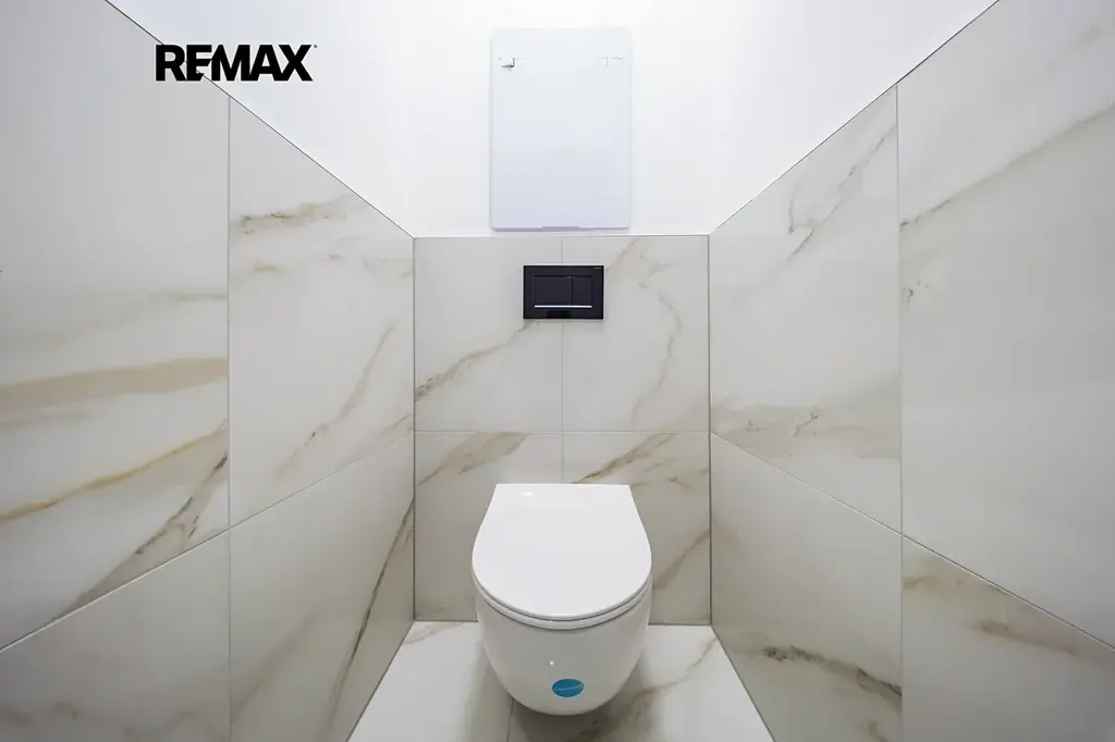 Koupelna (2,2m²) je vybavena topným žebříkem, designovým dotykovým zrcadlem se třemi režimy osvětlení a přípravou na pračku a sušičku. Toaleta je samostatná se systémem Geberit.