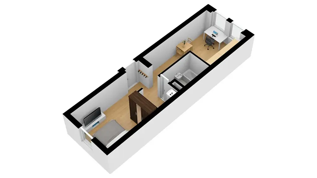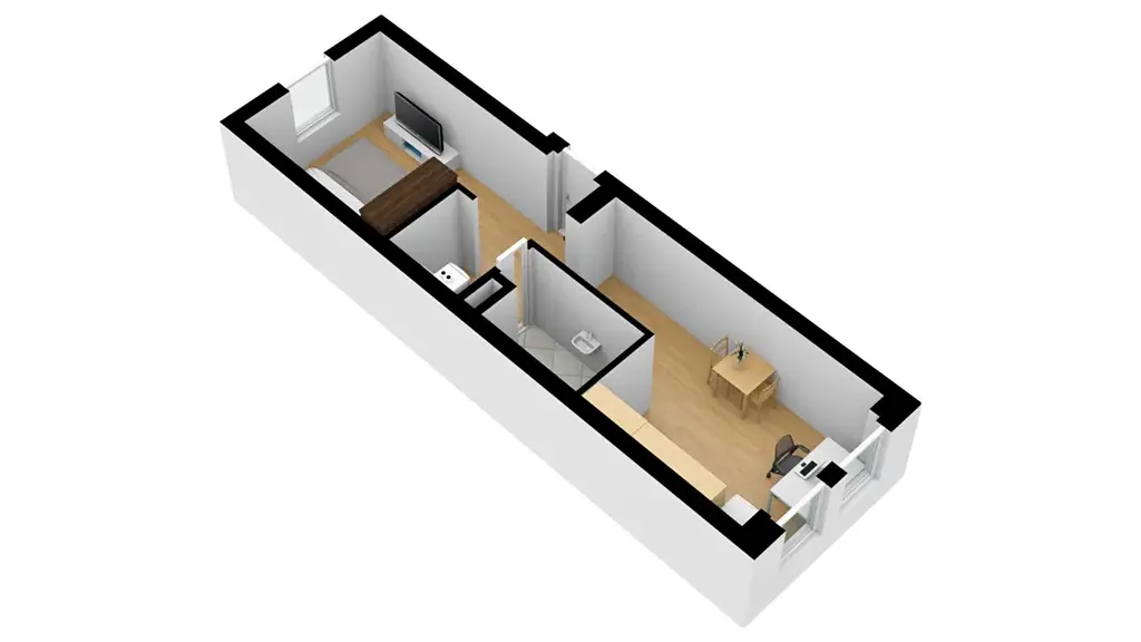 Dispozice bytu je 2+kk, plocha bytu je 37,9 m2 a nachází se v prvním patře. Skládá se z předsíně, koupelny s WC, pokoje s kuchyňským koutem a dalšího pokoje. Okno z pokoje s kuchyňským koutem je orientováno na západ do ulice, okno z druhého pokoje na východ do zahrady.