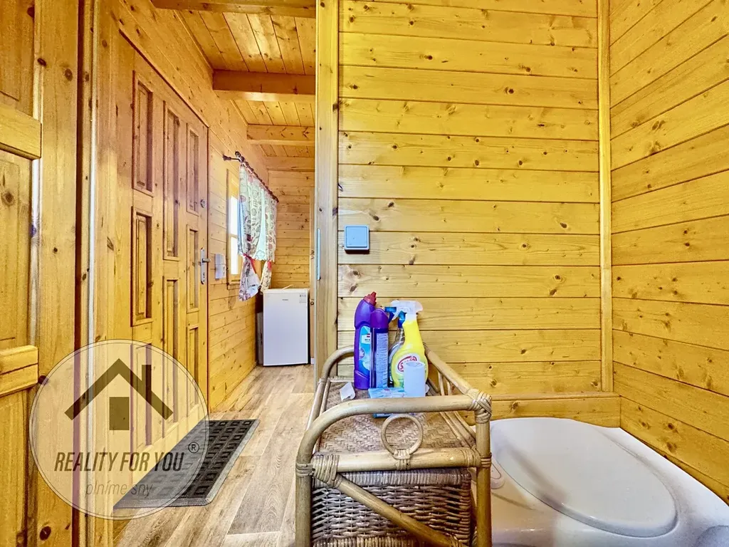 Novostavba chatky se zastavěnou plochou 36 m2 nabízí samotnou obytnou část s kuchyní, technické zázemí, místností s chemickou toaletou a podkroví, které je ideální pro přespání. Velká terasa je částečně zastřešena a nabízí krásný výhled na pozemek a do přírody.