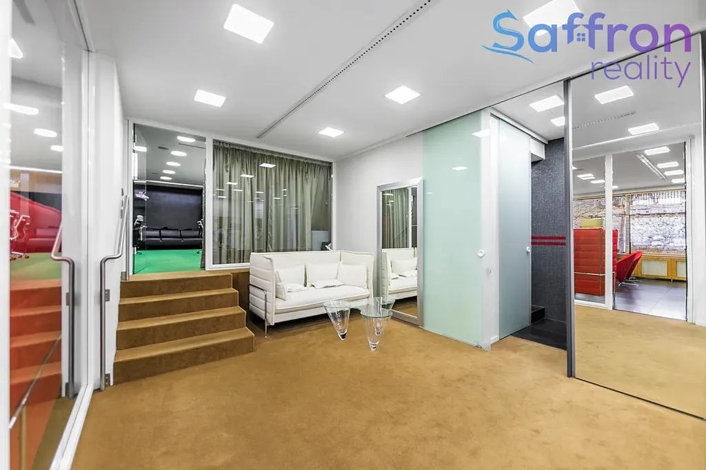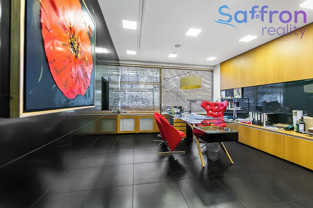 Jedná se o nebytovou jednotku o celkové podlahové ploše 155 m², která je dispozičně řešena jako kombinace samostatných kanceláří, otevřených pracovních prostor a reprezentativního zázemí. Součástí je vstupní recepce, prostorná zasedací místnost, kuchyňka a sociální zázemí včetně sprchy. Prosklené příčky dodávají interiéru vzdušnost a zároveň umožňují flexibilní uspořádání jednotlivých částí dle potřeb nového majitele.