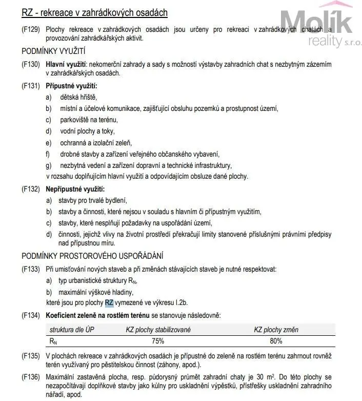 Hlavní využití: nekomerční zahrady a sady s možností výstavby zahradních chat s nezbytným zázemím v zahrádkářských osadách.