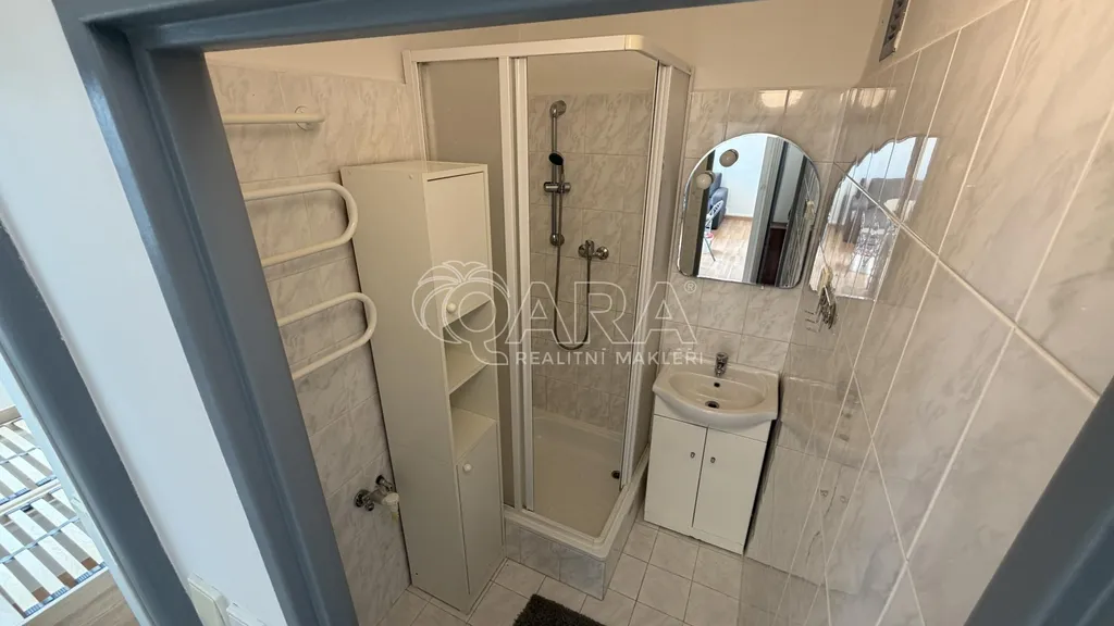 Koupelna je vybavena sprchovým koutem a umyvadlem se skříňkou, toaleta je oddělená. Příjemným benefitem bytu je zasklený balkon, který rozšiřuje obytný prostor a nabízí opravdu atraktivní výhled.