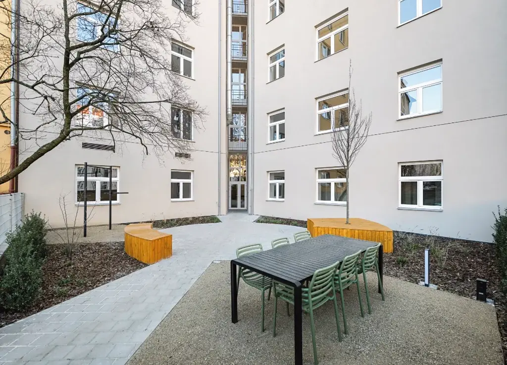 Součástí rezidence je k dispozici kočárkárna, menší posilovna a vnitroblok s posezením a sportovištěm.