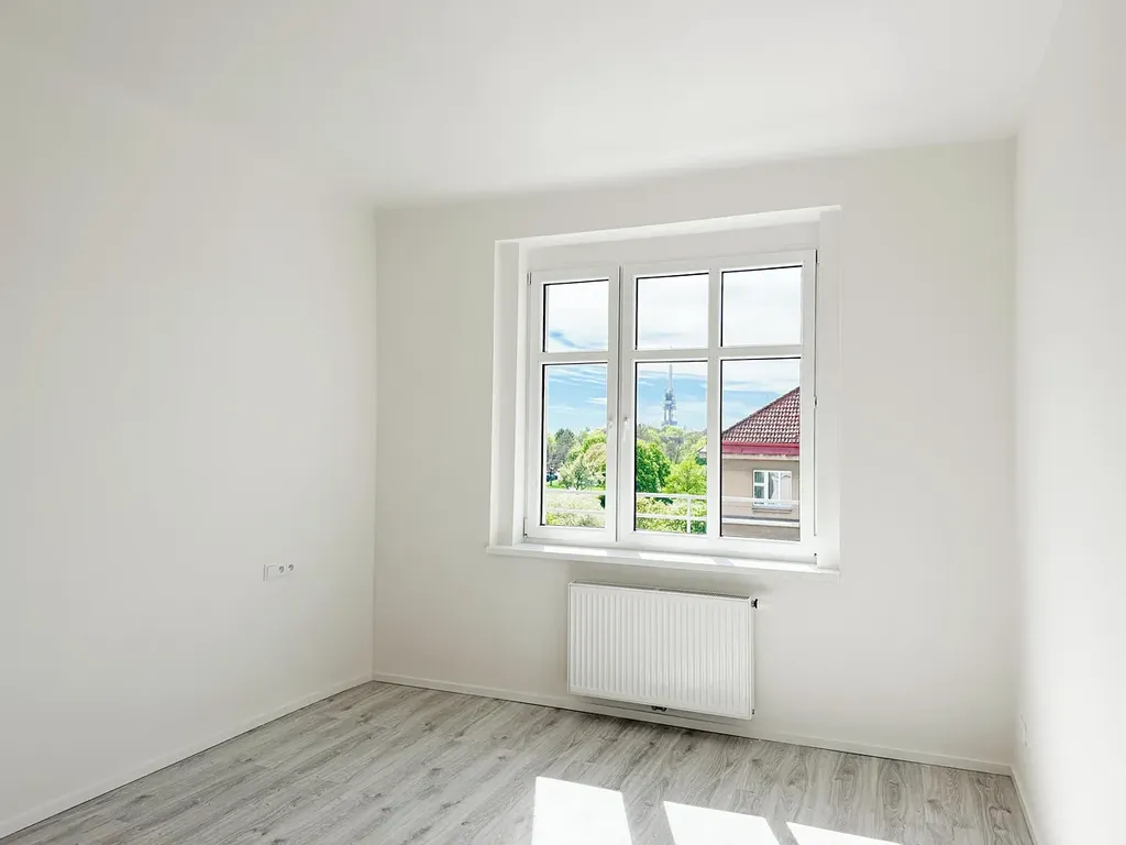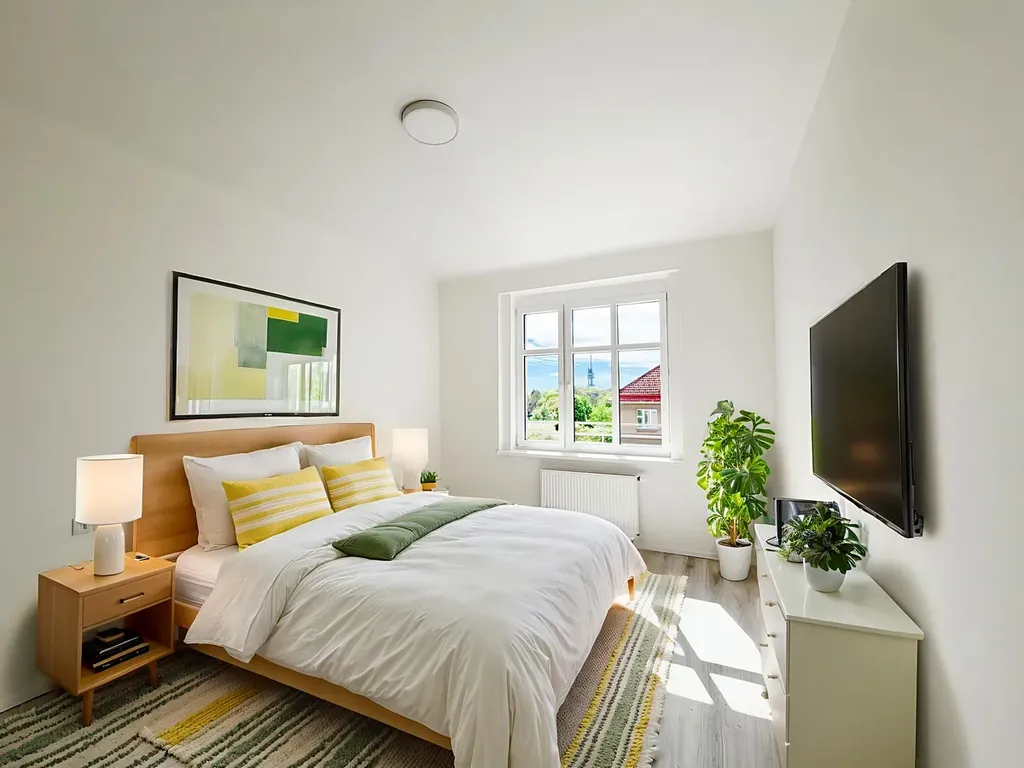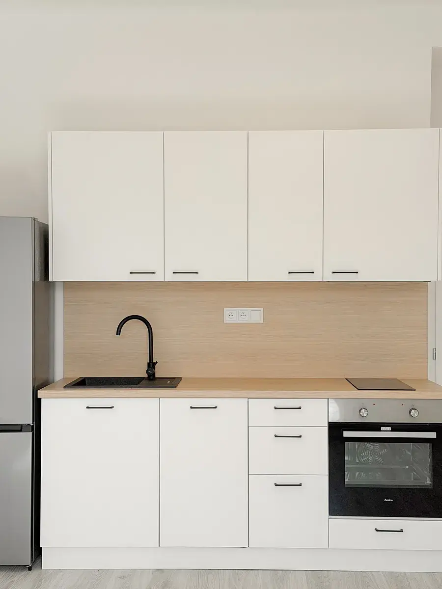 Byt se pronajímá s kuchyňskou linkou vybavenou lednicí s mrazákem, myčkou, troubou a sporákem. Obývací pokoj a ložnice jsou nezařízené, což umožňuje nájemci přizpůsobit si interiér dle vlastních představ.