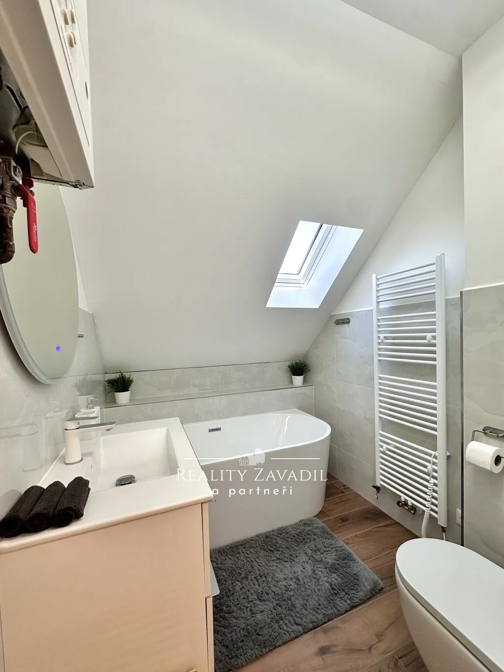 Koupelna je vybavena vanou, záchodem a umyvadlem se skříňkou. V těchto prostorách je rovněž umístěn vlastní plynový kotel, který zajišťuje nezávislé vytápění jednotky a ohřev vody. K bytu náleží zděný sklep poskytující další úložný prostor a nájemci mají k dispozici také sdílený půdní prostor, využitelný pro sušení prádla.